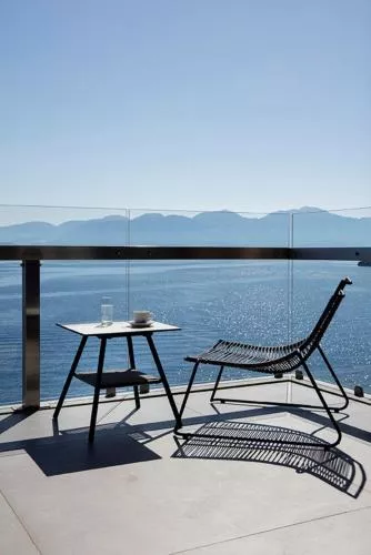 Dimensiuni: 47 mp Numar de camere: 3 camere Această suită amplasată pe marginea unei stânci oferă vedere minunată la Marea Egee imaculată. Suita include un dormitor cu zonă de relaxare în plan deschis și o baie privată cu finisaje din marmură, cabină de duș cu efect de ploaie separată și cadă. Mobilierul din lemn, modern și exclusivist întregește atmosfera deosebită.