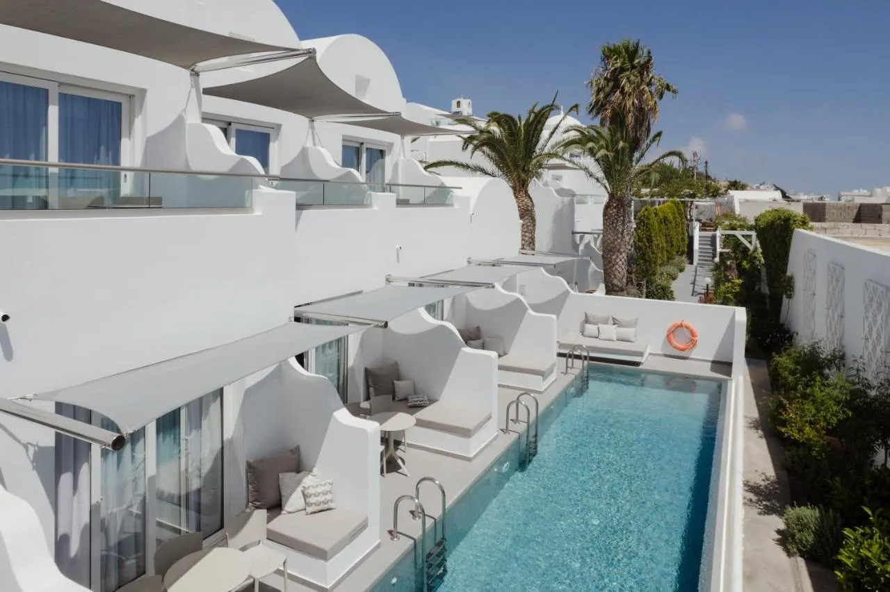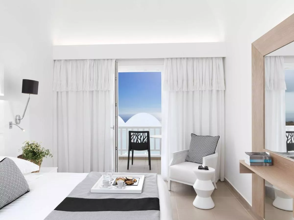 Un mic dejun tip bufet certificat grecesc, cu specialități din Santorini și delicatese tradiționale, este servit lângă piscină între orele 08:00 și 11:00. Barul de la piscină oferă o pauză răcoritoare de la soarele grecesc, servind mese ușoare din Santorini și internaționale, băuturi răcoritoare și cocktailuri.