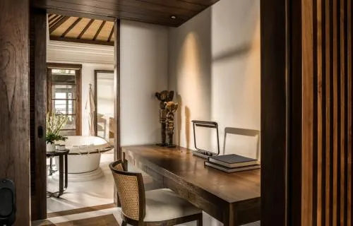 Dimensiuni: 180 mp Numar de camere: 3 camere Această vilă are un spațiu de living în interior și în aer liber cu o suprafață de 250 m² și o piscină infinită de 13 m². Pavilioanele de living/de luat masa și de baie, inspirate de casele balineze reprezentative, au acoperiș din stuf și sunt amplasate într-o grădină tropicală privată împrejmuită. Dormitorul spațios și baia au aer condiționat, iar foișorul cu zonă de zi se află în aer liber. Unitatea are 1 baie cu o cadă adâncă, duș interior și în aer liber, precum și vedere parțială la ocean și la complex.