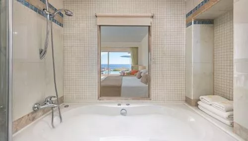 Dimensiuni: 61 mp Numar de camere: 2 camere This junior suite enjoys Aegean Sea view and features a 20-m2 private pool.