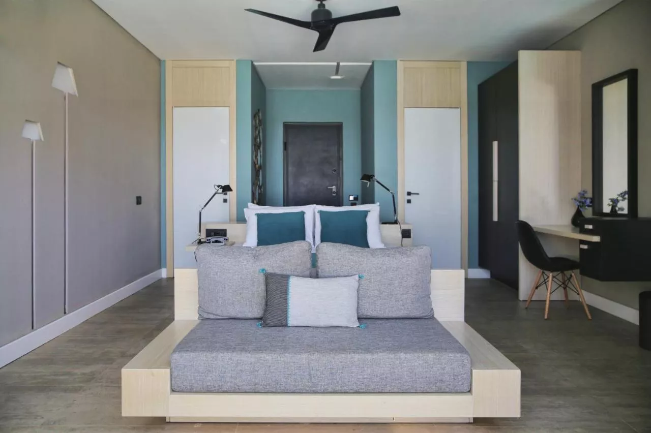 Dimensiuni: 27 mp Numar de camere: 1 camera This cosy, open-plan getaway enjoys the same sophisticated design and artistic nuances as all our suites. This elegant space will be your personal sanctuary throughout your dreamy holiday in Crete. With exceptional design, inspired comfort, and Med-retro décor, spend endless hours of relaxation.