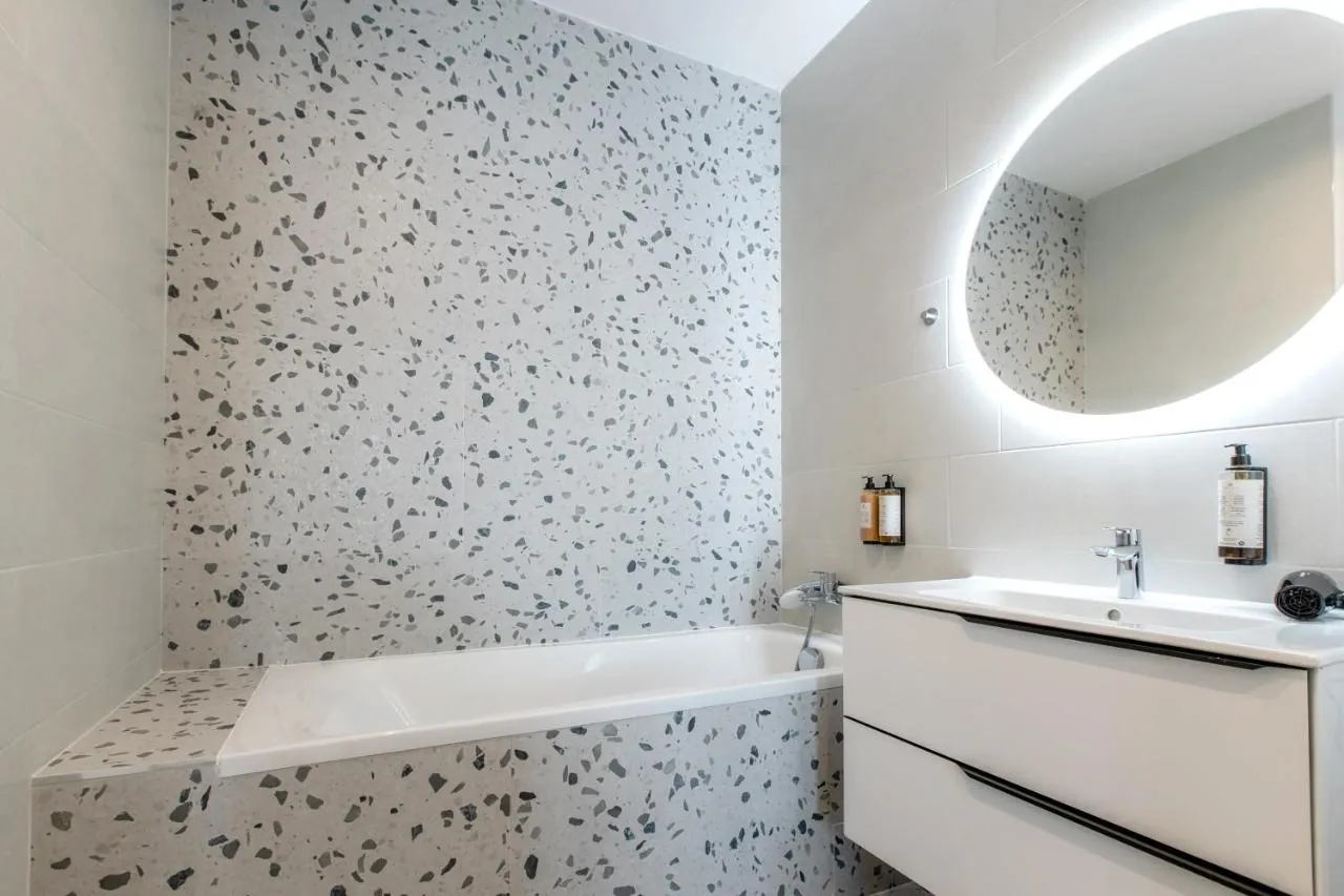 Baie: Halat de baie Baie comună Prosoape Uscător de păr Toaletă Duş Hârtie igienică Cadă General : Seif Pardoseală de lemn sau parchet Pardoseală de gresie/marmură Încălzire Izolare fonică Aer condiţionat Vedere: Vedere la mare Bucătărie: Masă Cuptor Frigider Plită de gătit Ustensile de bucătărie Chicinetă Bucătărie Accesibilitate: Etaje superioare accesibile cu liftul Media/Tehnologie: TV cu ecran plat TV Serviciu de streaming (ex. Netflix) Canale prin cablu Zonă de living: Canapea Zonă de luat masa Caracteristicile clădirii: Apartament privat în clădire Facilităţile camerei: Priză lângă pat Canapea extensibilă Mâncăruri și băuturi: Aparat pentru prepararea de ceai/cafea Exterior: Balcon Dormitor: Lenjerie de pat Garderobă sau dulap Distanțare fizică: Aer condiționat individual pentru fiecare cameră de la proprietate