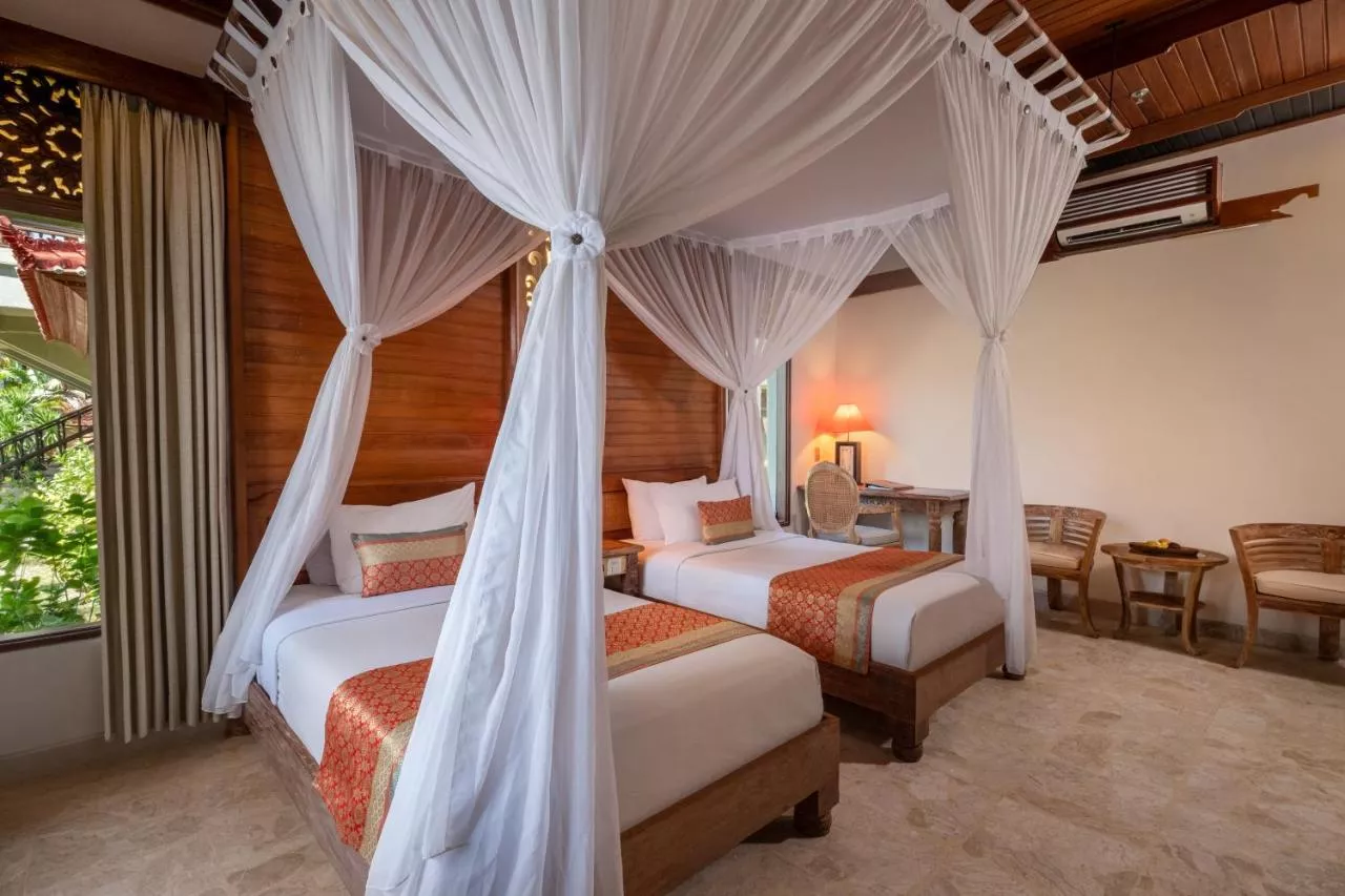 Dimensiuni: 52 mp Numar de camere: 12 camere Această cameră spaţioasă are decor tradiţional tipic zonei Bali şi este amplasată într-un bungalou cu tavan jos. Baia privată are duș şi cadă separată.
