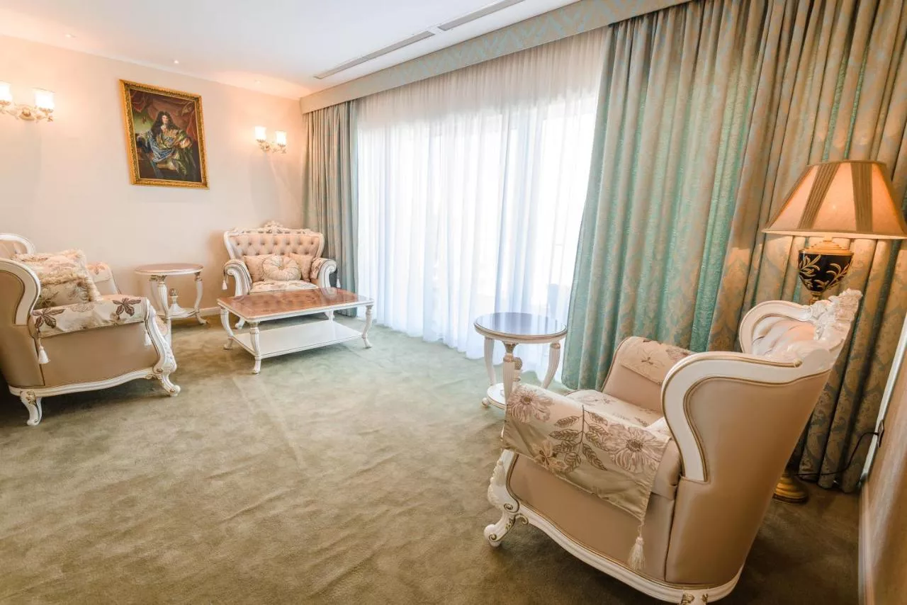 Dimensiuni: 33 mp Numar de camere: 5 camere Această cameră dublă Deluxe cu un design elegant are o baie cu duș, o zonă de relaxare și un balcon cu vedere la grădină.