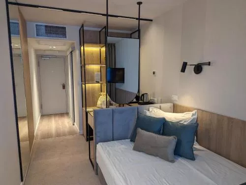 Dimensiuni: 32 mp Numar de camere: 16 camere Această cameră amenajată elegant include o canapea extensibilă, TV cu ecran plat, minibar, aer condiționat, baie cu duș și balcon cu vedere la grădină sau la oraș.