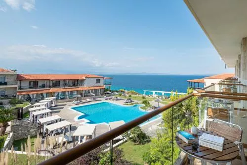 Situat pe o stâncă, la peste 60 de metri de plajă, Blue Bay Halkidiki dispune de 2 piscine exterioare neregulate cu vedere la Golful Toroneos și o terasă la soare cu șezlonguri și umbrele. Toate camerele au vedere panoramică la mare.