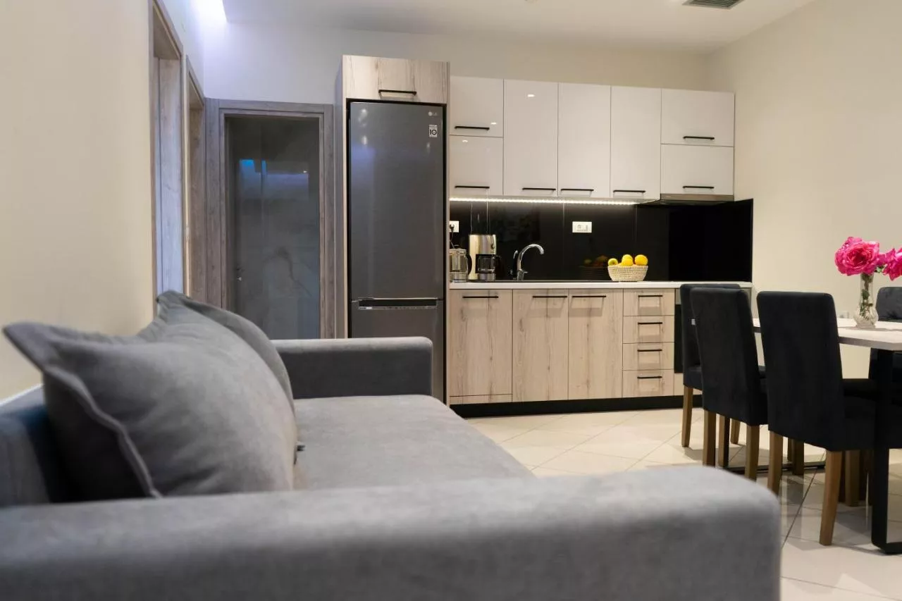 Dimensiuni: 28 mp Numar de camere: 1 camera This fully renovated room is decorated in white and grey tones and features hidden lighting, granite floors, working desk, seating area with large LED TV and a fully equipped kitchen. Baie privată cu duș