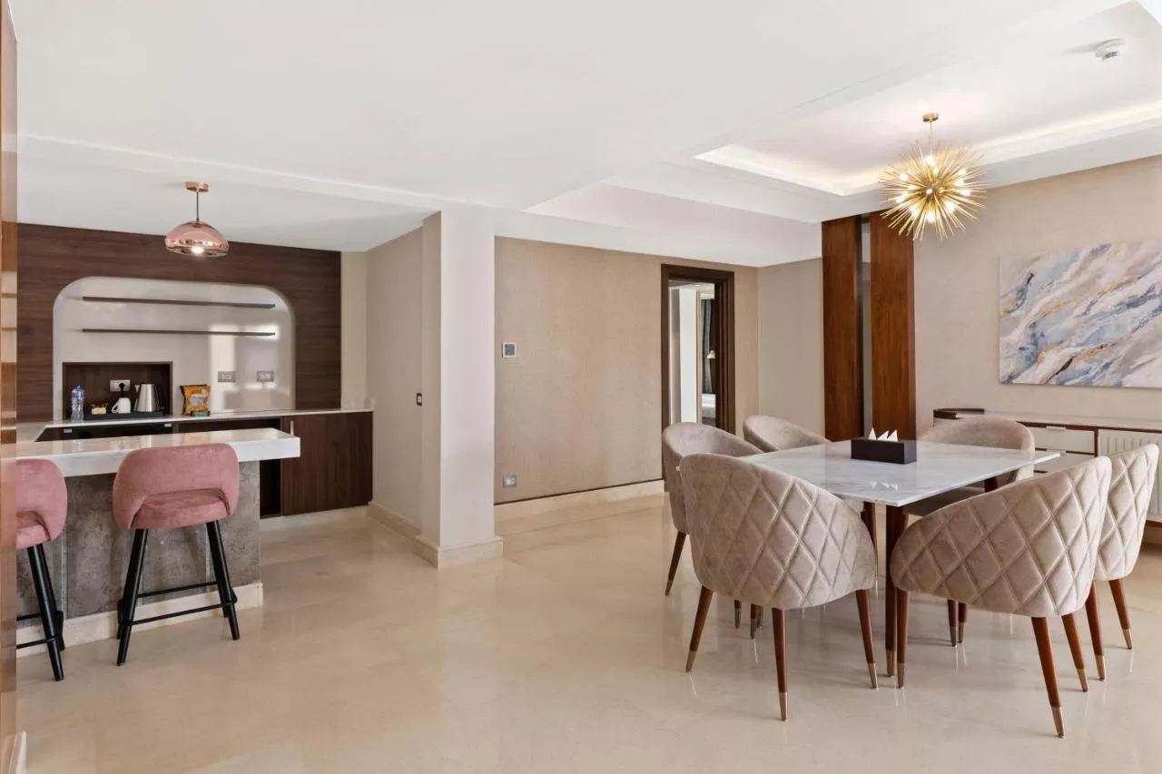 Dimensiuni: 81 mp Numar de camere: 4 camere This spacious suite consists of 1 living room, 1 separate bedroom and 2 bathrooms with a shower and free toiletries. The air-conditioned suite provides a flat-screen TV, a minibar, a seating area, a wardrobe as well as pool views. The unit offers 2 beds.