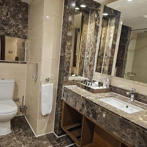 Baie: Halat de baie Prosoape Articole de toaletă gratuite Papuci de casă Uscător de păr Toaletă Duş Hârtie igienică Baie privată General : Seif Pardoseală de gresie/marmură Cameră(e) comunicantă(e) disponibilă(e) Aer condiţionat Media/Tehnologie: TV cu ecran plat Servicii: Serviciu de trezire Zonă de living: Canapea Zonă de relaxare Vedere: Vedere la piscină Facilităţile camerei: uscător de rufe Priză lângă pat Exterior: Balcon Dormitor: Lenjerie de pat Garderobă sau dulap Mâncăruri și băuturi: Minibar Bucătărie: Cană fierbător Produse de curățenie