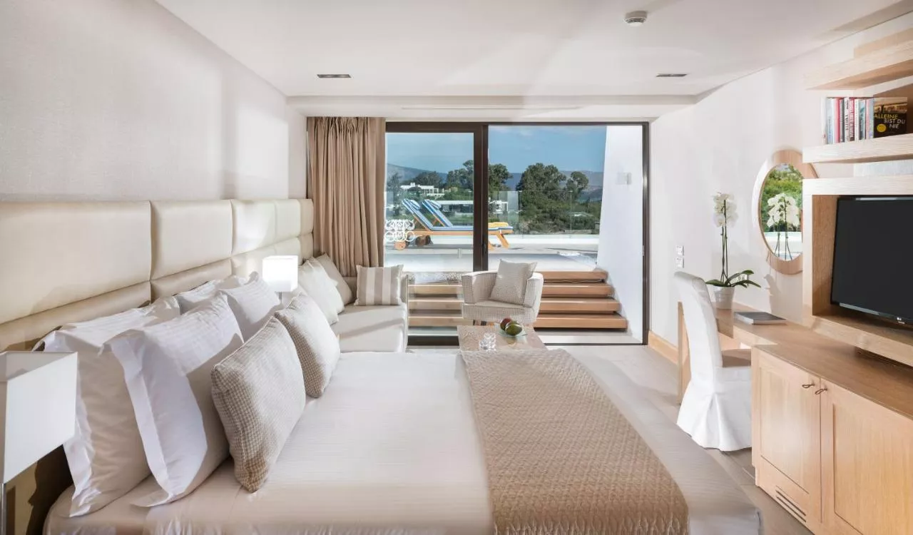 Dimensiuni: 60 mp Numar de camere: 5 camere Această suită are 1 dormitor, living separat sau în plan deschis, 1 sau 2 băi private cu TV, cadă spa și cabină de duș separată, iar unele suite au baie cu aburi și echipamente de sport moderne. Are balcon privat și vedere la golful Mirabello.