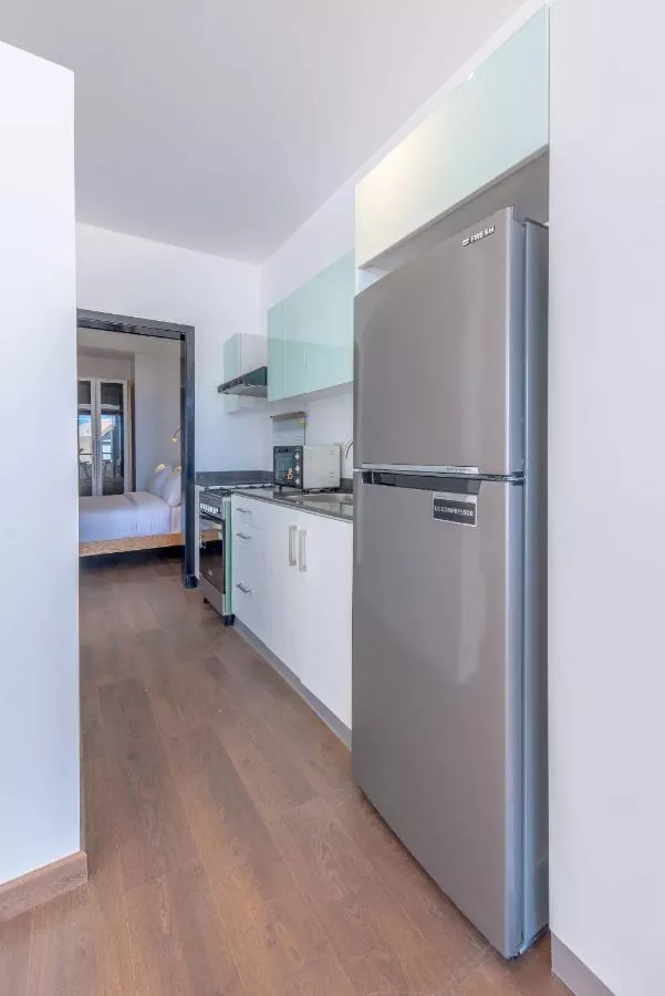 Food & Drink: Refrigerator Kitchen Dining area Electric kettle Kitchenware Oven Stovetop Dining table Bottle of water Fruits Chocolate or cookies