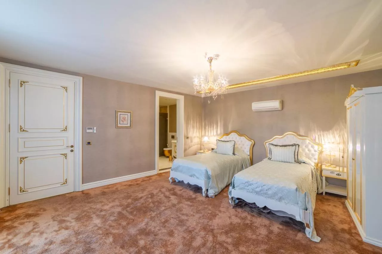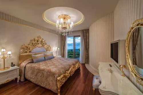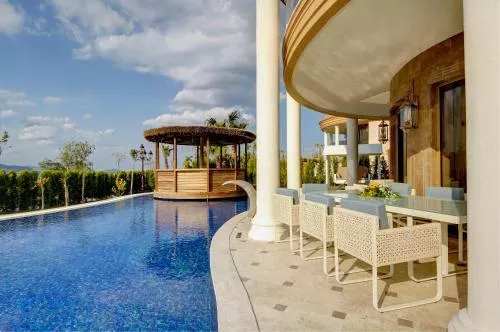 Dimensiuni: 725 mp Numar de camere: 1 camera Grand Villas cu două etaje oferă o terasă amenajată în aer liber unde se află o piscină privată mare, cu leagăn cu baldachin, șezlonguri și zonă de relaxare. Vilele pun la dispoziție o piscină interioară încălzită, saună, hamam turcesc, precum și biciclete. La parter există un dormitor cu 2 paturi de o persoană și o baie separată, un living opulent cu zonă de luat masa și de relaxare, bucătărie utilată și baie pentru oaspeți. La etajul superior se află 4 dormitoare la care se poate ajunge folosind liftul rezidențial. Fiecare dintre dormitoare este prevăzut cu dressing sau dulap și baie privată, iar într-un dormitor există 2 paturi de o persoană. Un pat king-size rotund și o cadă cu hidromasaj cu vedere la mare sunt elementele esențiale ale dormitorului matrimonial, iar datorită amplasării sale centrale, la etaj, acesta beneficiază de vedere la Marea Egee. Baie privată cu cadă