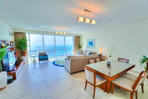 Dimensiuni: 344 mp Numar de camere: 2 camere Apartamentele incredibil de spaţioase se află la etajele superioare 15 - 32 şi oferă vedere la ocean şi la Palm Jumeirah. Cele 4 dormitoare cu baie privată includ un dormitor matrimonial cu dulap, precum și o cadă și duș separat, iar unitatea de cazare are, de asemenea, o cameră de serviciu care poate fi folosită și ca o cameră de copii, precum și un living spațios, o zonă de luat masa și o bucătărie complet utilată. Baie privată cu cadă
