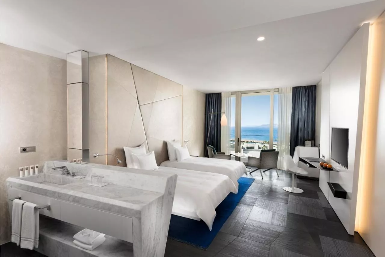 Dimensiuni: 40 mp Numar de camere: 7 camere This modern, tastefully decorated room boasts an eye-catching sea view, 7/24 WiFi to always stay in touch and a marble bathroom. A king size bed is offered in this elegant room while a flat-screen TV is also featured for your entertainment. Baie privată cu duș