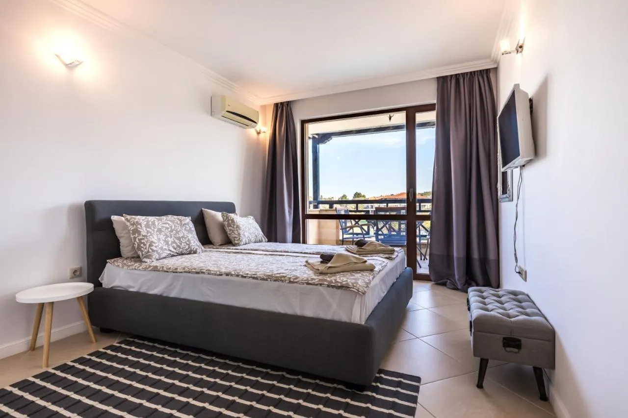 Dimensiuni: 80 mp Numar de camere: 3 camere The apartment consists of 1 bedroom, living room with sofa bed and equipped kitchen, 1 bathroom, terrace. The kitchen is equipped with a stove, oven, refrigerator, electric kettle and dishes. It overlooks the pool and the garden. Please note that the room photos are only examples of a specific room type. Your actual room may be decorated differently and there is no guarantee that you will be accommodated in the exact same room as shown in the photos.