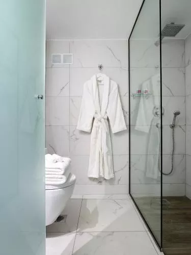 - baie cu halate de baie, papuci, uscător de păr și duș tip walk-in