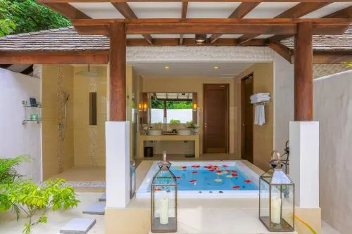 Dimensiuni: 215 mp Numar de camere: 1 camera Această reședință pe plajă cu piscină spa privată are o piscină privată de relaxare pe plaja privată. Include o chicinetă cu o masă, un frigider de vin și un minibar. Baia în aer liber are o cadă spa, o cabină de duș cu efect de ploaie și articole de toaletă Bulgari.