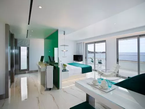 Dimensiuni: 61 mp Numar de camere: 2 camere Această suită are sistem de iluminat mascat și lucrări de artă elegante, amplasate de jur-împrejur. Suita include un pat dublu king-size și o zonă de living separată, cu o canapea de colț confortabilă. Oaspeții au la dispoziție baie privată, dotată cu duș walk-in cu jeturi la nivelul corpului, precum și piscină privată. Dormitorul elegant este dotat cu un sistem audio multicameră conectat la un TV cu ecran plat de 55 inch și este orientat către o terasă cu mobilier personalizat și vedere la mare. Baie privată cu cadă