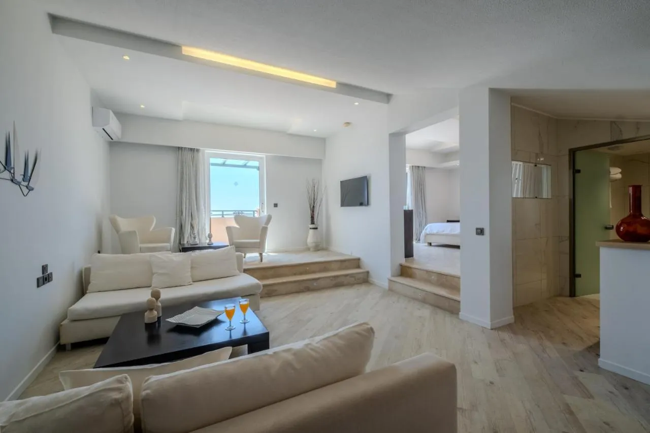 Dimensiuni: 50 mp Numar de camere: 2 camere Această suită include 1 cameră de zi, 1 dormitor separat și 1 baie cu duș sau cadă și articole de toaletă gratuite. Suita are pereți izolați fonic, aer condiționat, TV cu ecran plat cu canale prin satelit, minibar și aparat de ceai/cafea și oferă vedere la mare. Unitatea de cazare include 3 paturi. Baie privată cu cadă sau duș