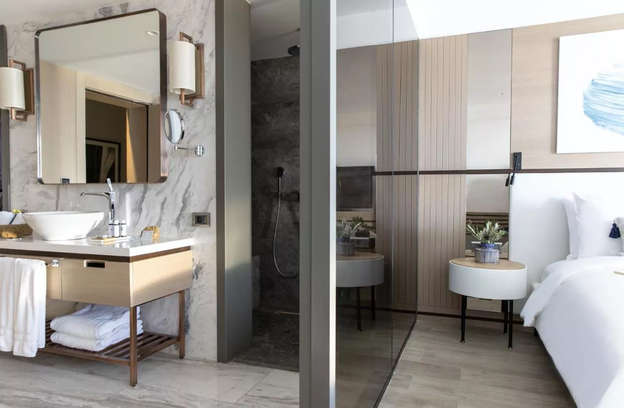 Dimensiuni: 125 mp Numar de camere: 3 camere Situată la primul etaj, Suita cu 2 dormitoare și vedere la mare are 125 m² și include propriul balcon cu vedere la mare de 180 de grade. Are spațiu suficient pentru o familie sau un grup de prieteni și include lenjerie de pat confortabilă, un living mare și o bucătărie complet utilată care permite libertate și liniște sufletească pentru sejururi mai lungi. Este o unitate de cazare cu aspect actual și are design modern și elegant. Baie privată cu duș