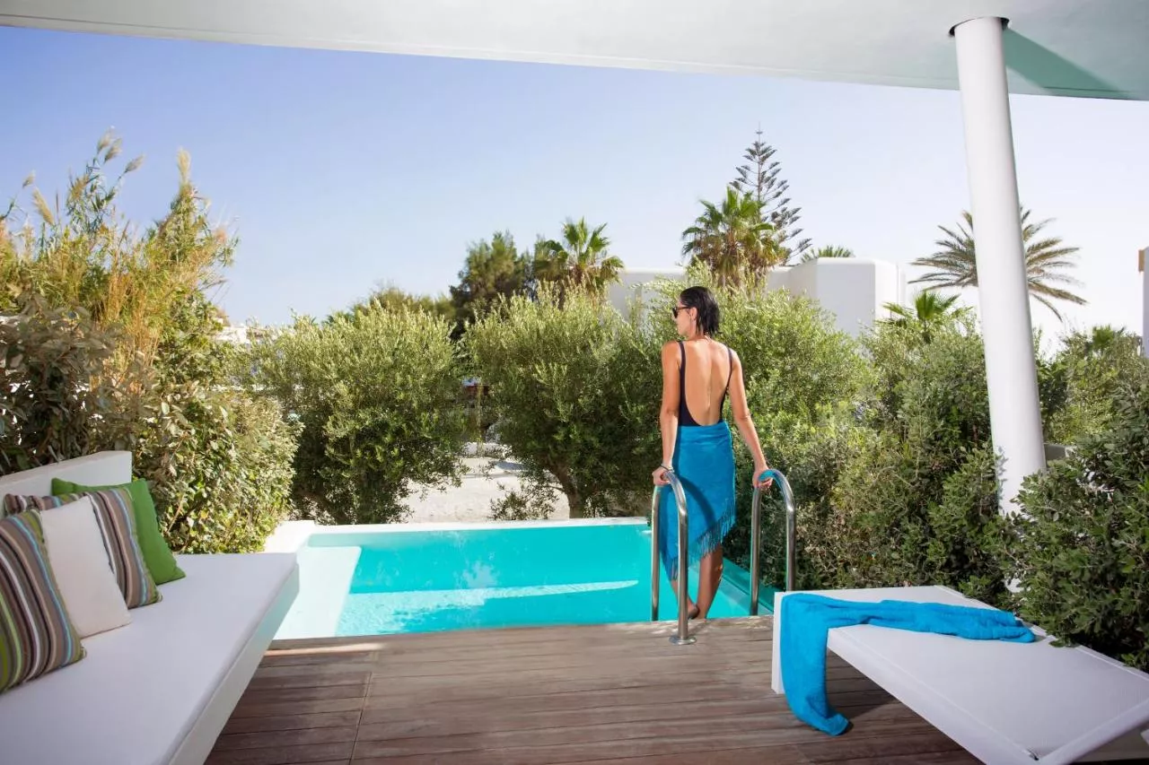 Dimensiuni: 65 mp Numar de camere: 1 camera Această suită elegantă de 70 m² are o piscină privată în aer liber şi vedere la mare de pe terasă. Include un dormitor, o zonă de relaxare separată cu canapele şi o baie cu duş cu aburi. Se asigură prosoape de plajă gratuite.