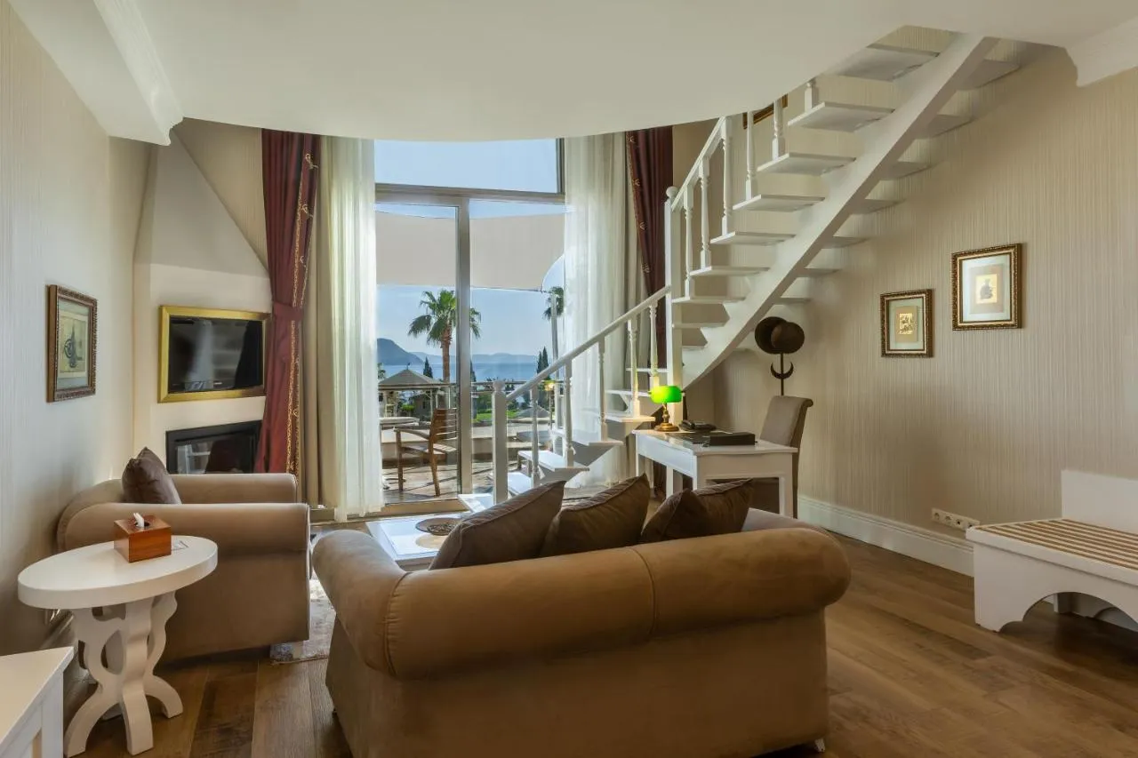 Grădini suspendate și 7 piscine îi așteaptă pe oaspeții acestui hotel de lux din Bodrum. Bucătăria mediteraneană este servită pe plaja hotelului, Elani Beach, care dispune de o marină privată.