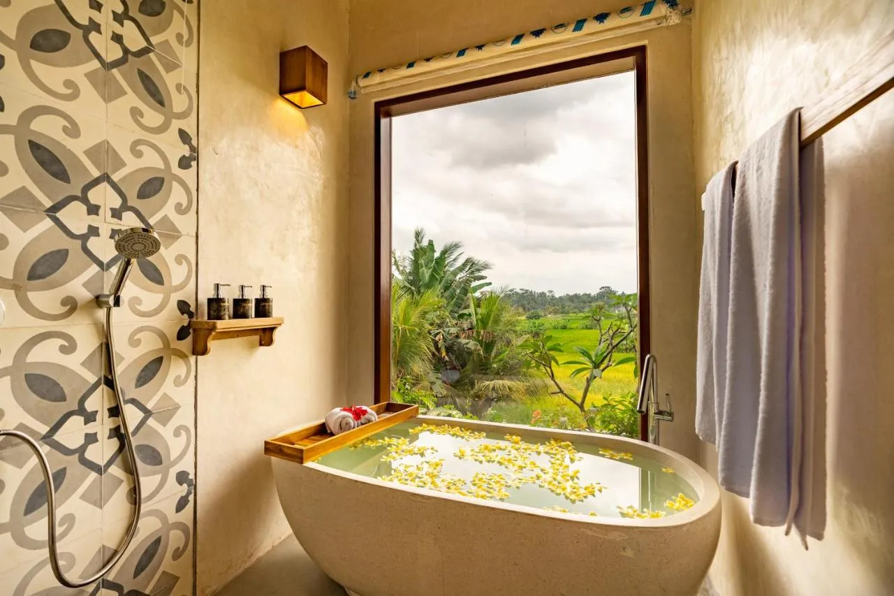 Bliss Ubud este un resort boutique înconjurat de o vedere luxuriantă asupra câmpurilor de orez, cu spa și cameră de yoga disponibile.