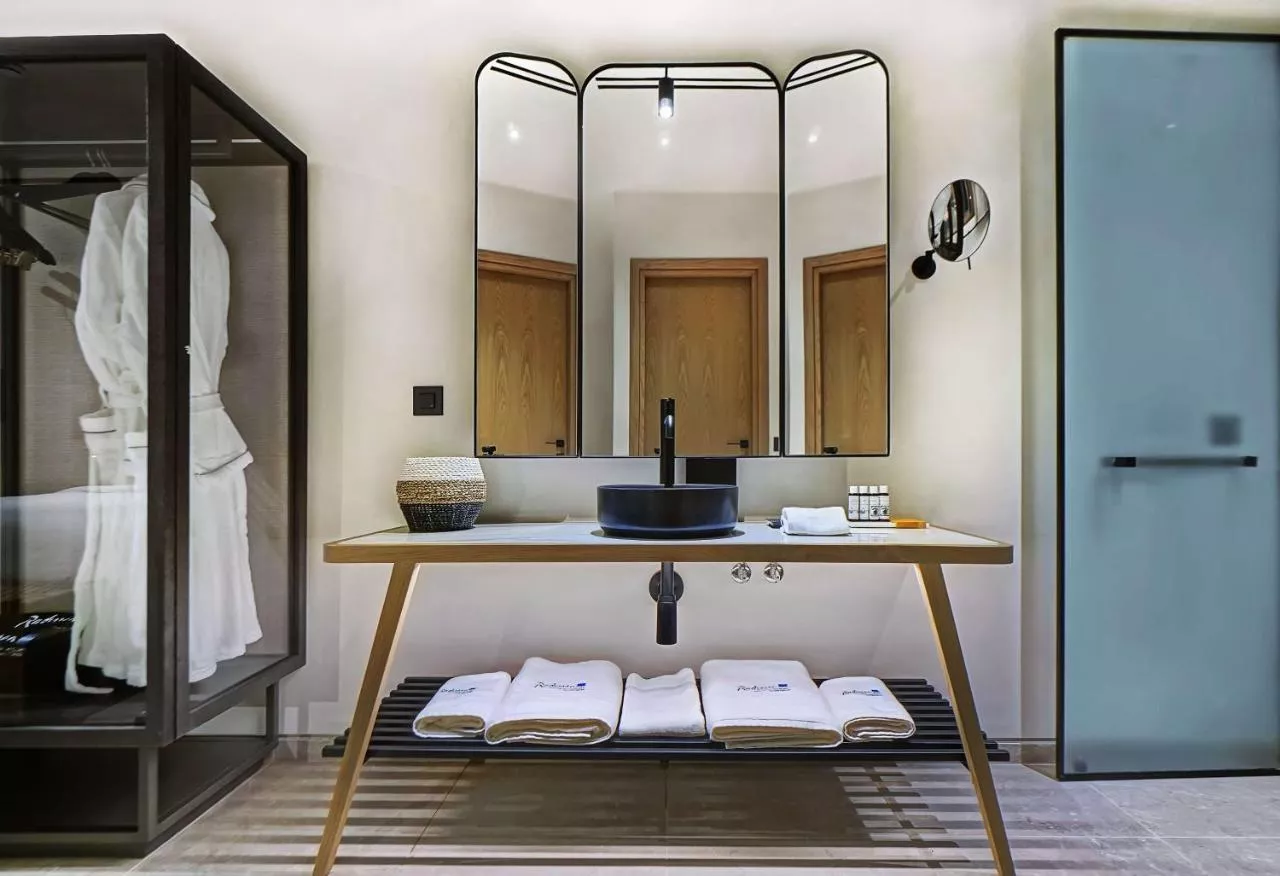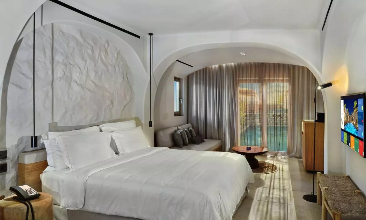 Hotelul oferă oaspeților camere cu aer condiționat, dotate cu un birou, o mașină de cafea, un minibar, un seif, un televizor cu ecran plat și o baie privată cu duș. La Radisson Blu Zaffron Resort, Santorini, camerele sunt dotate cu lenjerie de pat și prosoape.