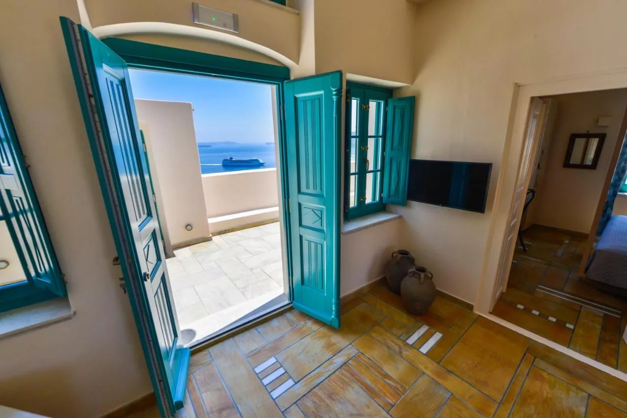 Dimensiuni: 51 mp Numar de camere: 2 camere This one-bedroom villa of 50 square metres it features one bedroom with a double bed, a living room with built-in sofa and bed, a kitchenette plus a dining area and a bathroom with a shower. It also boasts a private terrace with a hot tub, Caldera views and stunning Aegean Sea views. It has two entrances for more flexibility. Private bathroom with bath