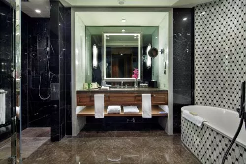 Dimensiuni: 115 mp Numar de camere: 4 camere Featuring elegant décor with luxurious furnishings, this air-conditioned room offers floor-to-ceiling windows, a flat-screen TV and a private bathroom including a bath tub, shower, hairdryer, slippers and free toiletries. The suite is located between 19th and 33rd floors. Guests can benefit from free access to Executive Lounge, complimentary breakfast, beverages and snacks throughout the day, also alcoholic drinks from 18:00 to 20:00. In addition to these features, the room includes an oven, microwave, washing machine dryer, dishwasher, hood, cooker and kitchenware.