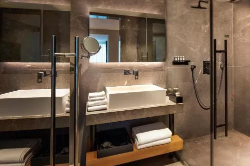Dimensiuni: 50 mp Numar de camere: 1 camera Our Green Suites, with a spacious area of 50 square meters, are ready to offer an exceptional accommodation experience. These suites feature a comfortable seating area, a well-equipped workspace for your convenience, and luxuriously designed bathrooms. Being the largest suite type in our hotel, the Green Suites also provide accommodation for up to 4 people, making them our highest-capacity suites. Baie privată cu duș