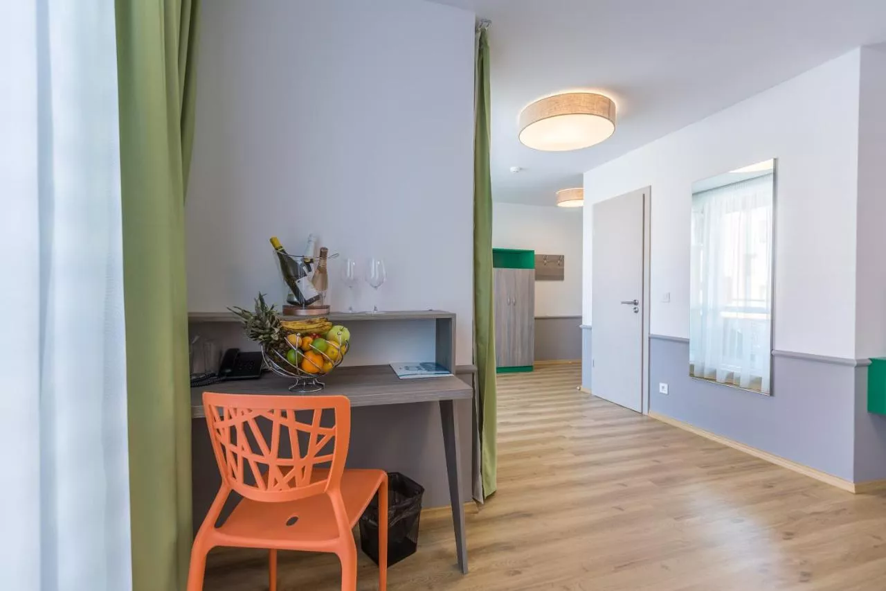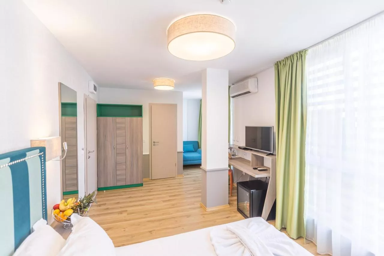Dimensiuni: 70 mp Numar de camere: 1 camera Această suită spațioasă are 1 living, 2 dormitoare separate și 1 baie cu duș și articole de toaletă gratuite. Suita oferă aer condiționat, minibar, TV cu ecran plat cu canale prin cablu şi balcon. Unitatea de cazare este prevăzută cu 4 paturi.