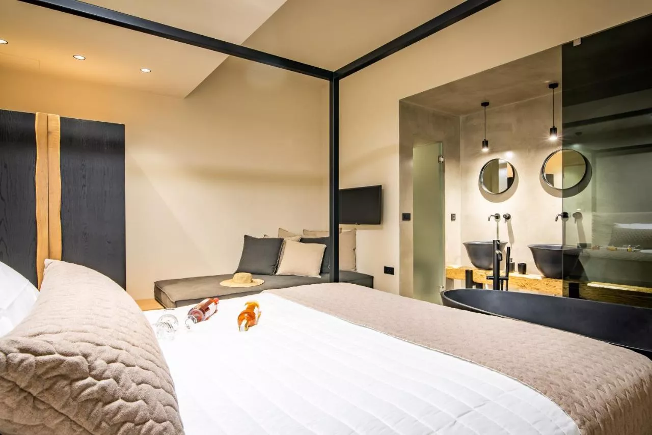 Dimensiuni: 21 mp Numar de camere: 1 camera Both Junior suites offer distinct interiors, one featuring a large circular bathtub that fits 2 people. It is ideal for guests that want take advantage of a relaxing bath. The other one focuses more on the unique style with the glass wall, a steel frame around the bed and the oval tub. Guests can request for their preferred room, subject to availability.