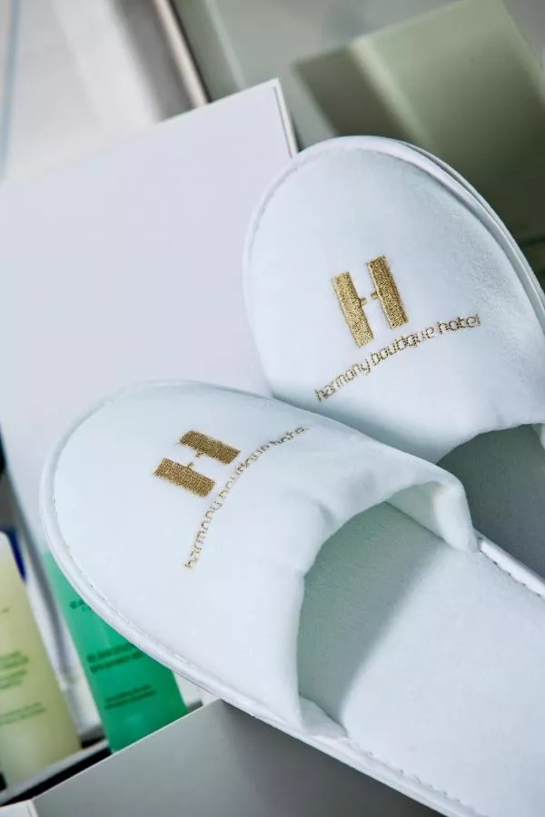 Fiecare dintre balcoanele private ale Harmony oferă vederi către orașul Mykonos și Marea Egee și un loc perfect pentru a admira frumosul apus. Fiecare cameră dispune de ferestre cu geam dublu și cântare. La sosire, oaspeților li se oferă un pahar de băutură de bun venit.