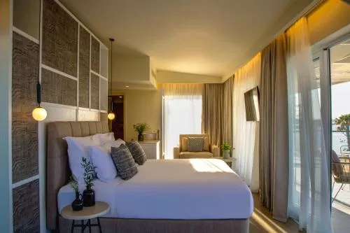 Baie: Halat de baie Prosoape Articole de toaletă gratuite Papuci de casă Uscător de păr Toaletă Duş Hârtie igienică Cadă Baie privată General : Seif Fier de călcat Facilităţi de călcat Pardoseală de gresie/marmură Izolare fonică Plasă de ţânţari Aer condiţionat Vedere: Vedere la mare Accesibilitate: Etaje superioare accesibile cu liftul Media/Tehnologie: TV cu ecran plat TV Telefon Canale prin cablu Canale prin satelit Servicii: Serviciu de trezire Zonă de living: Canapea Zonă de relaxare Facilităţile camerei: Priză lângă pat Canapea extensibilă Mâncăruri și băuturi: Aparat pentru prepararea de ceai/cafea Exterior: Balcon Bucătărie: Frigider Cană fierbător Dormitor: Lenjerie de pat Garderobă sau dulap