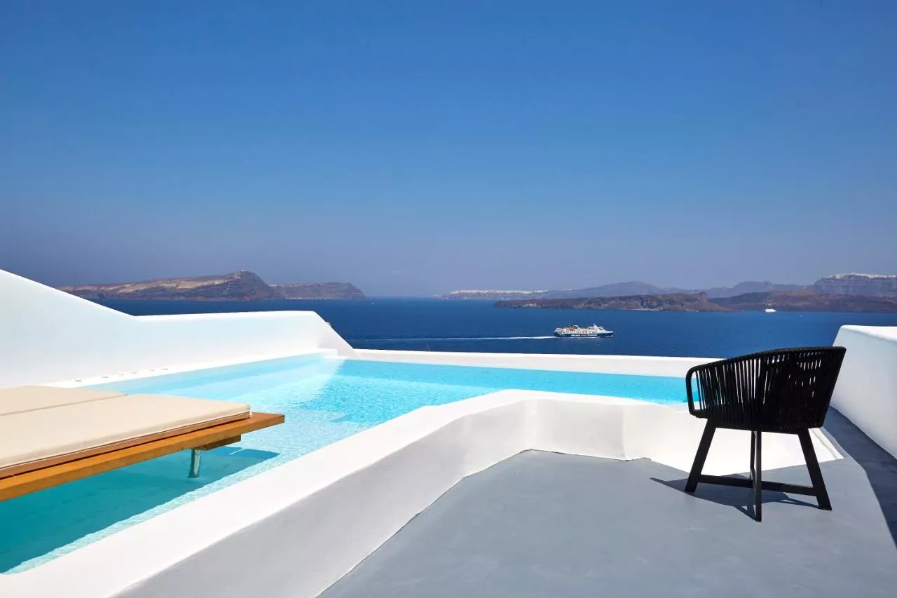 Dimensiuni: 45 mp Numar de camere: 2 camere Suită sofisticată, cu vedere panoramică la Marea Egee și la caldeira emblematică. Are o terasă spaţioasă cu piscină infinită privată și încălzită, cu jeturi de hidromasaj. Baie privată cu cadă