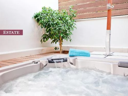 Located adjacent to the Venetian dome the luxurious Spa Suite features a private garden with an outdoor hot tub, a spacious living room area and a bathroom with shower bath. Baie privată cu cadă