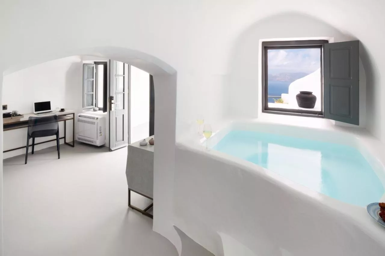 Dimensiuni: 65 mp Numar de camere: 1 camera This air-conditioned suite includes a balcony with Caldera views, bathrobe and a private pool. Baie privată cu cadă