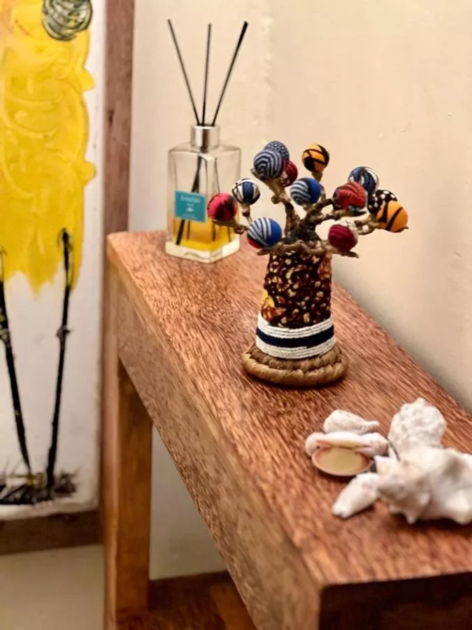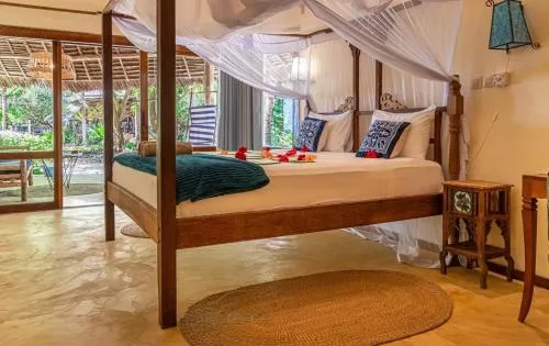 Camerele sunt găzduite în unități tradiționale de bungalouri, prezentând arhitectura locală Zanzibari și frunze de palmier uscate pentru acoperiș. Mobilierul este realizat local, iar interioarele sunt completate cu pestelee în culori de ocean, create folosind războaie de țesut tradiționale.
