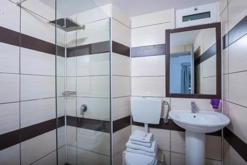 Dimensiuni: 25 mp Numar de camere: 18 camere The studio features air conditioning, a coffee machine, as well as a private bathroom boasting a shower and a hairdryer. In the well-fitted kitchenette, guests will find a stovetop, a refrigerator, kitchenware and a toaster. The studio is furnished with a desk and a seating area and provides a dining area and a wardrobe. The unit has 3 beds. Baie privată cu duș