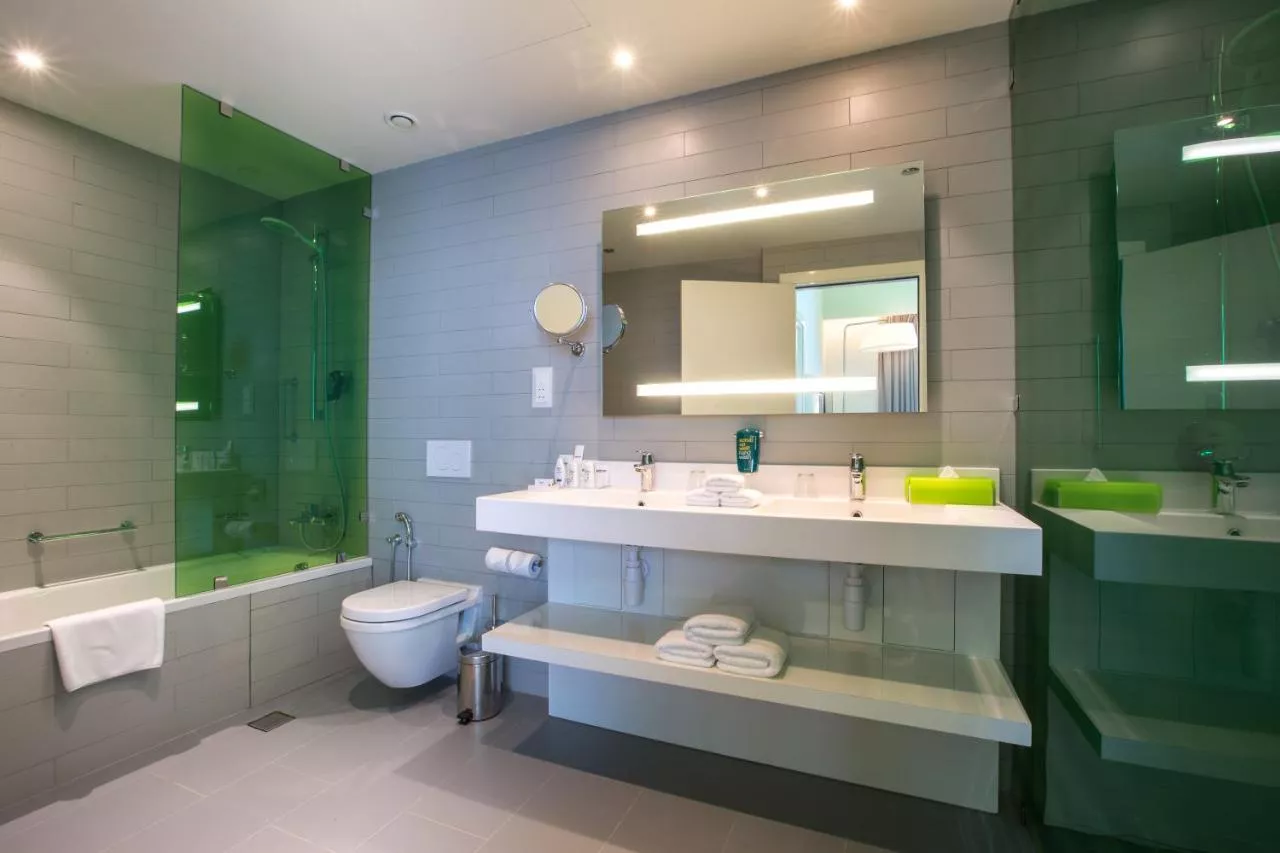 Dimensiuni: 52 mp Numar de camere: 3 camere These air-conditioned Junior suites having a unique view over the start and finish line of the Autodrome race course. It features a bedroom and living area with sofa bed. The room features a coffee machine, microwave and airfryer and the bathroom is fitted with a shower, a bathtub, hairdryer, bathrobe, slippers and free toiletries. Walk-in closet provides extra space for your storage. Baie privată cu cadă