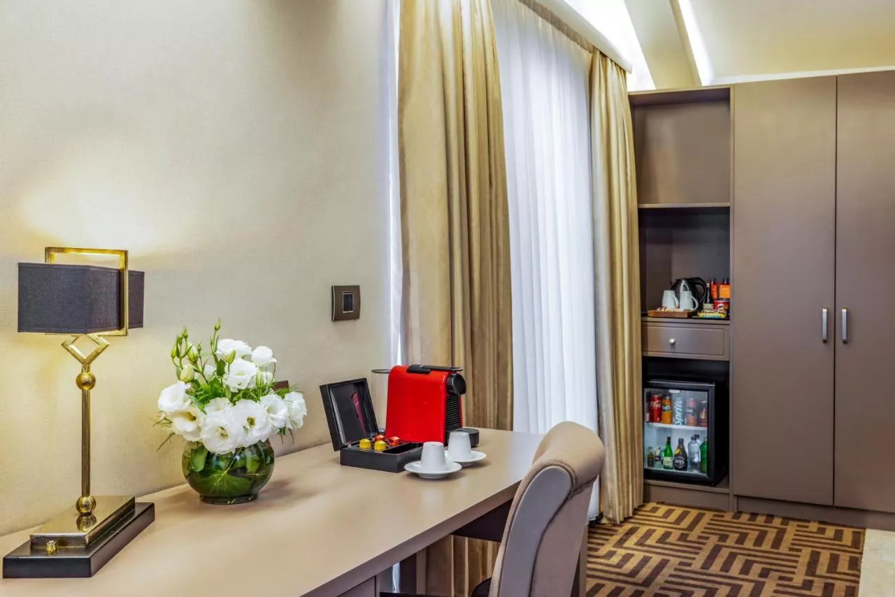 General : Seif Facilităţi de călcat Izolare fonică Aer condiţionat Accesibilitate: Etaje superioare accesibile cu liftul Media/Tehnologie: TV cu ecran plat TV Telefon Canale prin satelit Servicii: Serviciu de trezire Facilități de siguranță: Purificatoare de aer Baie: Prosoape Articole de toaletă gratuite Papuci de casă Uscător de păr Toaletă Duş Hârtie igienică Baie privată Facilităţile camerei: Priză lângă pat Mâncăruri și băuturi: Aparat pentru prepararea de ceai/cafea Minibar Dormitor: Lenjerie de pat Garderobă sau dulap Bucătărie: Cană fierbător Produse de curățenie Distanțare fizică: Aer condiționat individual pentru fiecare cameră de la proprietate Curățenie și dezinfectare: Dezinfectant pentru mâini