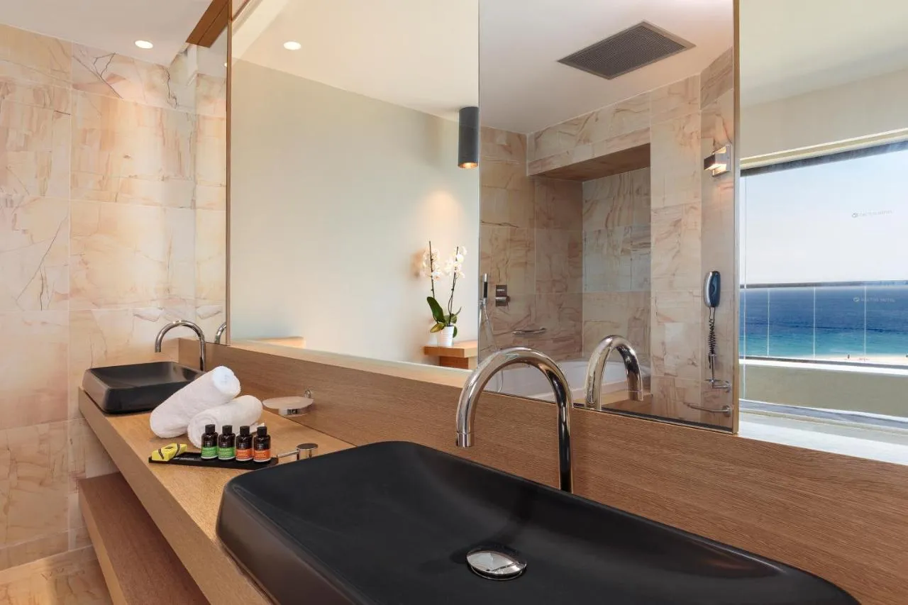 Baie: Halat de baie Prosoape Toaletă suplimentară Papuci de casă Uscător de păr Toaletă Baie suplimentară Hârtie igienică Cadă Baie privată General : Seif Pardoseală de gresie/marmură Aer condiţionat Vedere: Vedere la mare Accesibilitate: Etaje superioare accesibile cu liftul Media/Tehnologie: TV cu ecran plat TV Telefon Servicii: Serviciu de trezire Zonă de living: Canapea Exterior: Mobilier de grădină Balcon Facilităţile camerei: Priză lângă pat Canapea extensibilă Mâncăruri și băuturi: Aparat pentru prepararea de ceai/cafea Bucătărie: Frigider Cană fierbător Dormitor: Lenjerie de pat Garderobă sau dulap