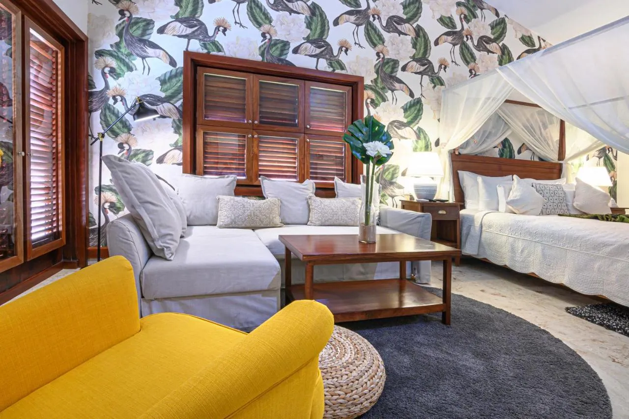Dimensiuni: 47 mp Numar de camere: 6 camere Această cameră dublă spațioasă are intrare privată, aer condiționat, baie privată cu duș, precum și terasă cu vedere la grădină.