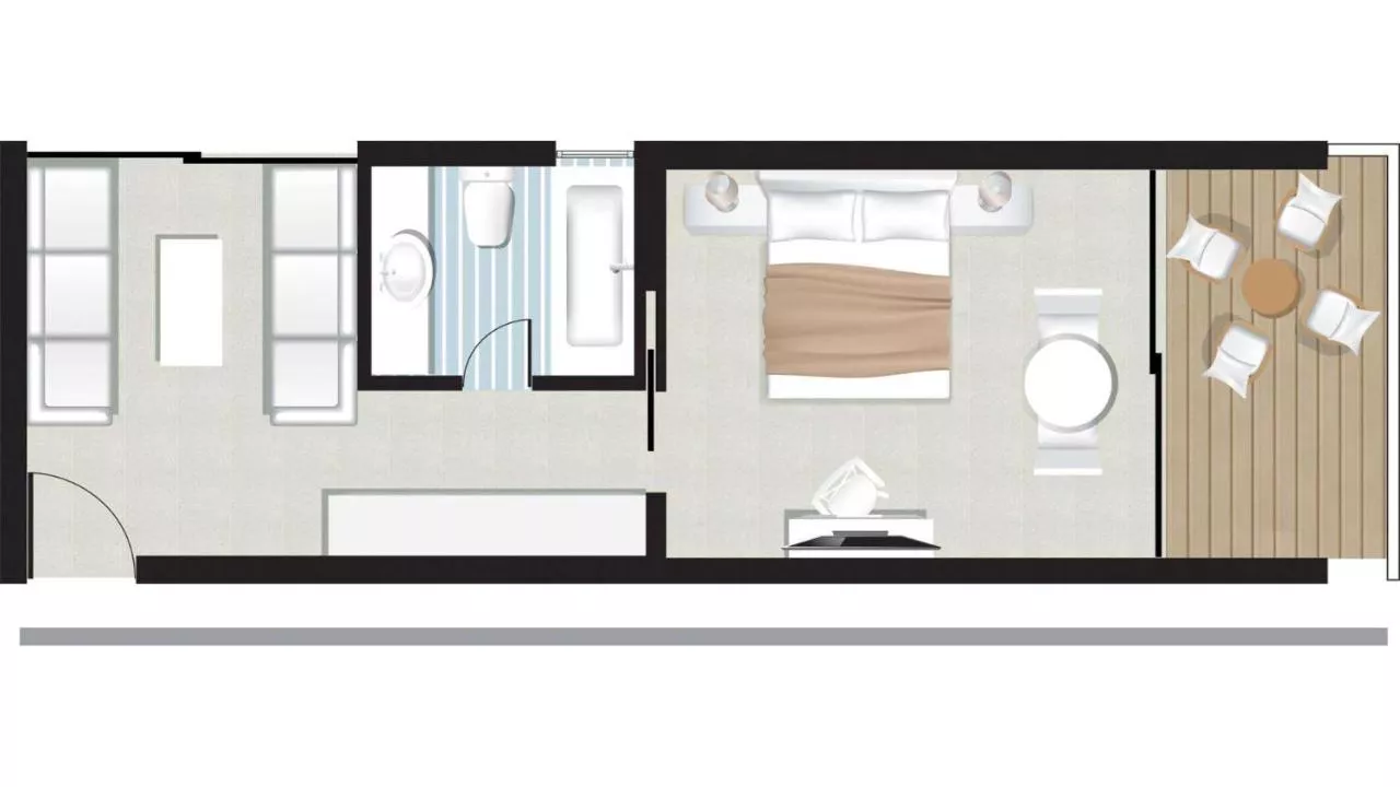 Dimensiuni: 36 mp Numar de camere: 2 camere A unique open-plan design and large sliding glass doors mimic the expansiveness of the Cape Sounio and its bay. Step onto the terrace to enjoy the side views of the Aegean and the Temple of Poseidon. Each bungalow features a master bedroom with en-suite dining and living area, including a sofa bed for a third guest.