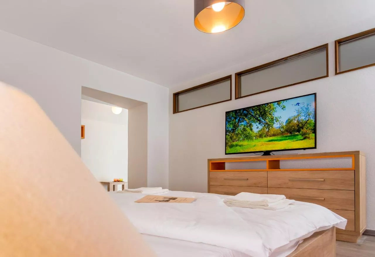 Dimensiuni: 62 mp Numar de camere: 2 camere This spacious suite consists of 1 living room, 1 separate bedroom and 1 bathroom with a shower and free toiletries. Guests can make meals in the kitchen that is equipped with a stovetop, a refrigerator, a dishwasher and kitchenware. The air-conditioned suite provides a flat-screen TV with cable channels, a washing machine, a private entrance, soundproof walls as well as an inner courtyard view. The unit offers 2 beds.