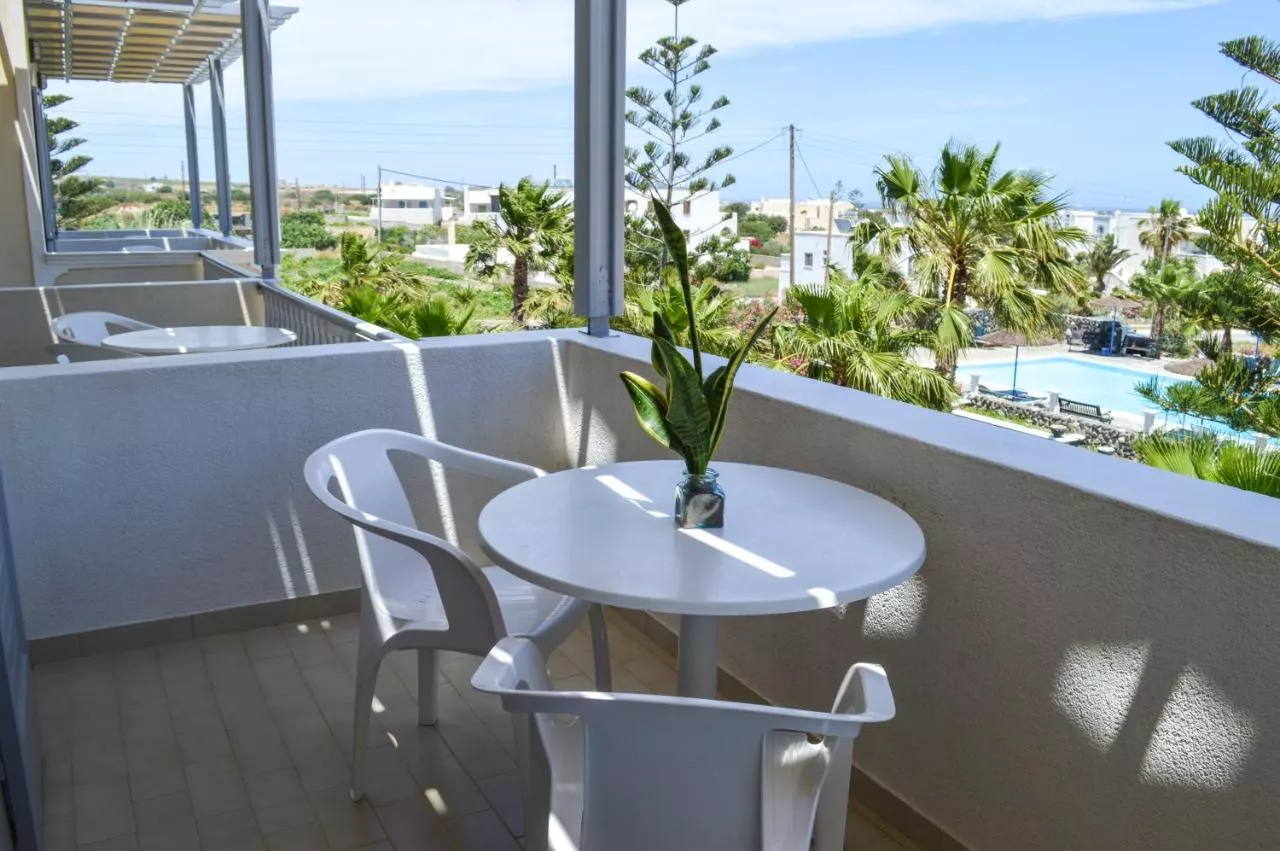 Un mic dejun tip bufet este servit zilnic în zona de luat masa. Seara, oaspeții se pot bucura de zona de grătar sau pot face o plimbare până la cosmopolita plajă Kamari, care oferă o largă selecție de restaurante tradiționale, cafenele, baruri, magazine și chiar un cinematograf în aer liber.