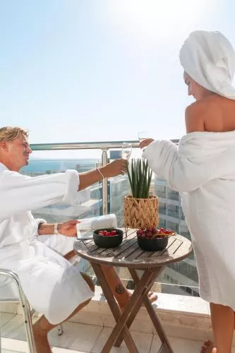 Dimensiuni: 35 mp Numar de camere: 1 camera Large suite with bathroom with spa bath, spacious living room with 32-inch flat-screen TV and kitchen corner, and balcony with view to the pool.