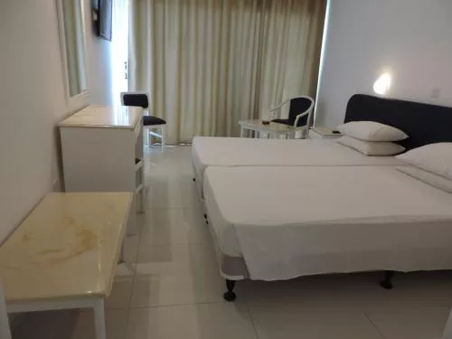 Camerele de la Hotelul Corfu sunt dotate cu aer condiționat și au balcoane private cu vedere la Marea Mediterană sau la continent. Fiecare este dotată cu televizor cu ecran plat și satelit.