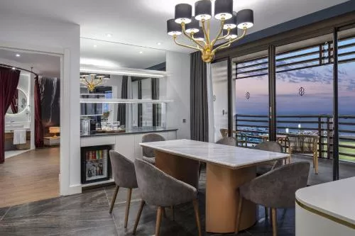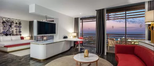 Dimensiuni: 116 mp Numar de camere: 2 camere King Suite rooms have 2 bedrooms (1 french bed + 1 twin bed), 1 living room, 2 bathrooms and 3 LED TVs. With balconies and sea views, these rooms have all equipment that complies with the 5 Star Deluxe norms.